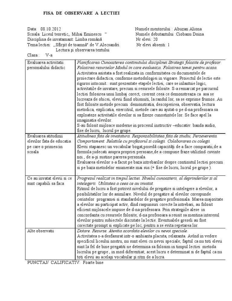 Fisa De Observare A Lectiei Completata Invatamant Primar