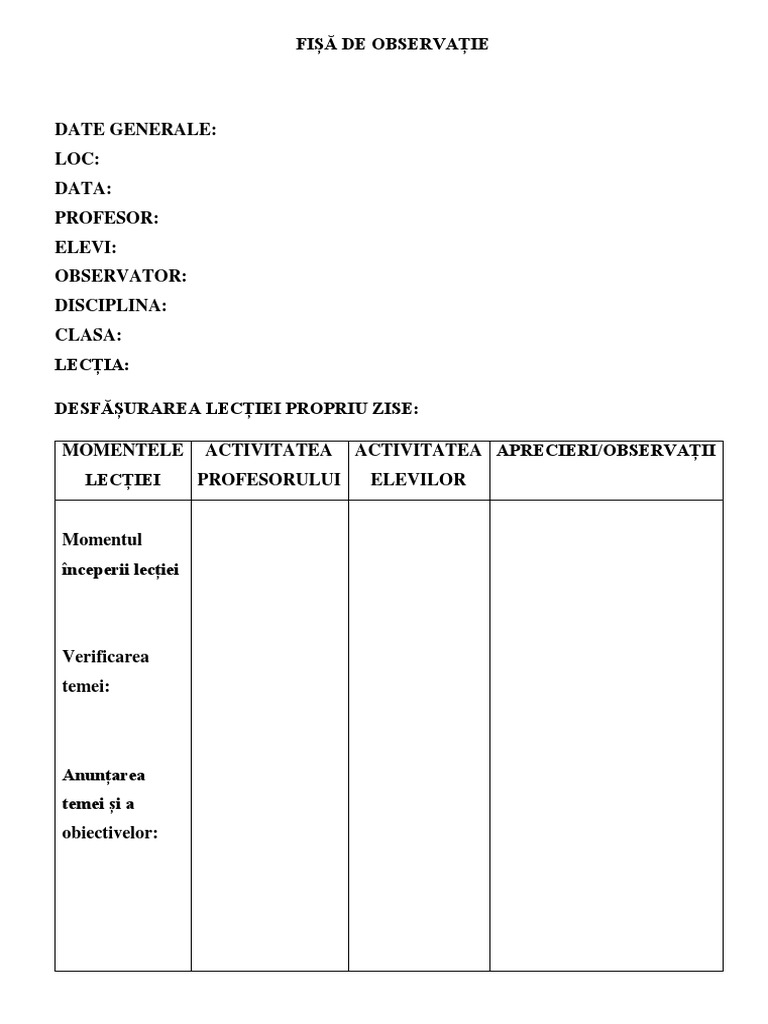 Proiect Fisa De Observare A Lectiei Clasa A Ix A Pedagogie