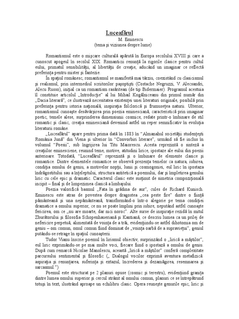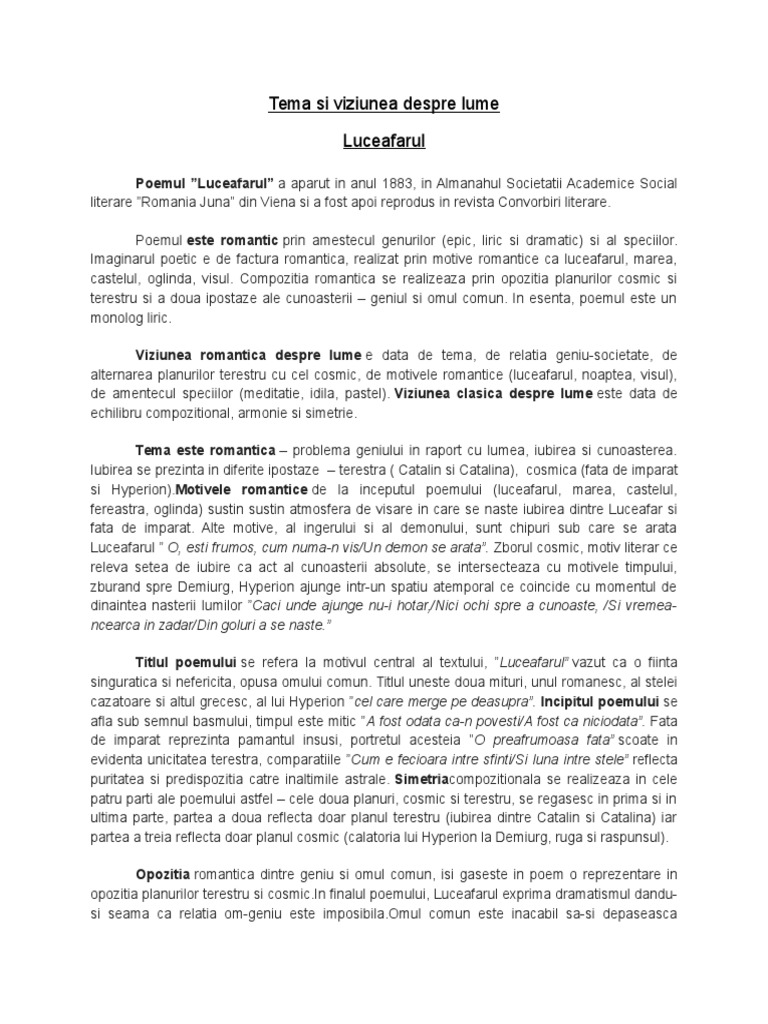 Luceafarul Tema Si Viziunea Despre Lume Pdf Document