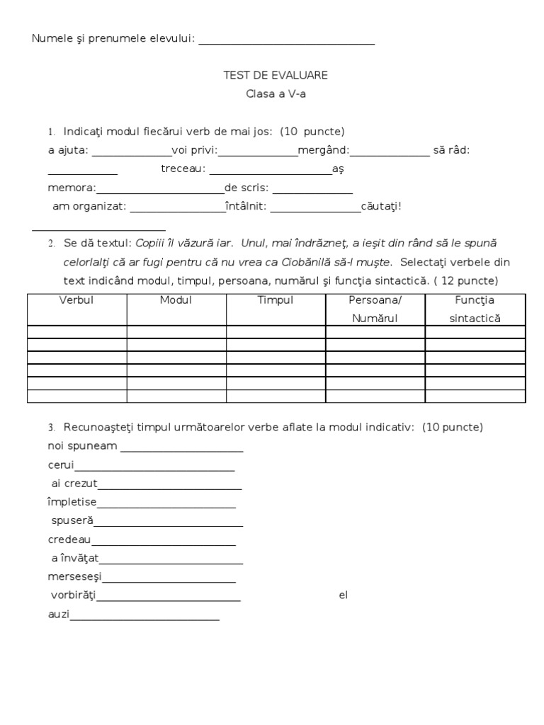Test De Evaluare Verbul Clasa A Va