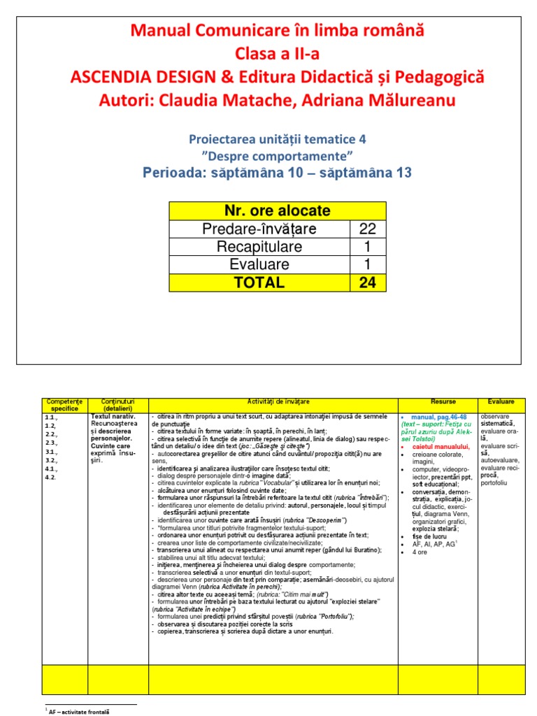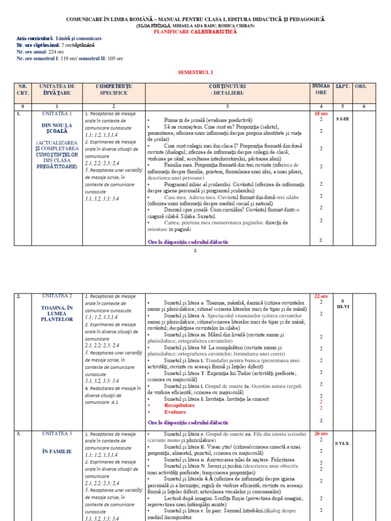 Planificare Pentru Manualul De Comunicare In Limba Romană Clasa I