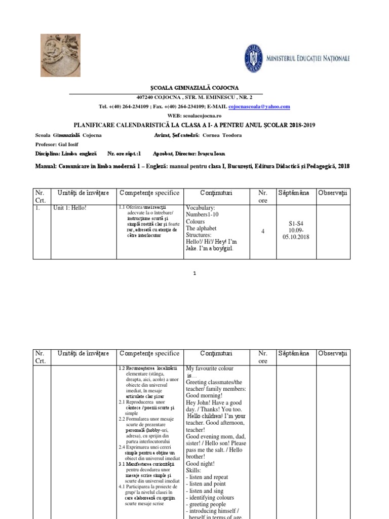 Planificare Anuala La Clasa A I A Pentru Anul Scolar 2018 2019