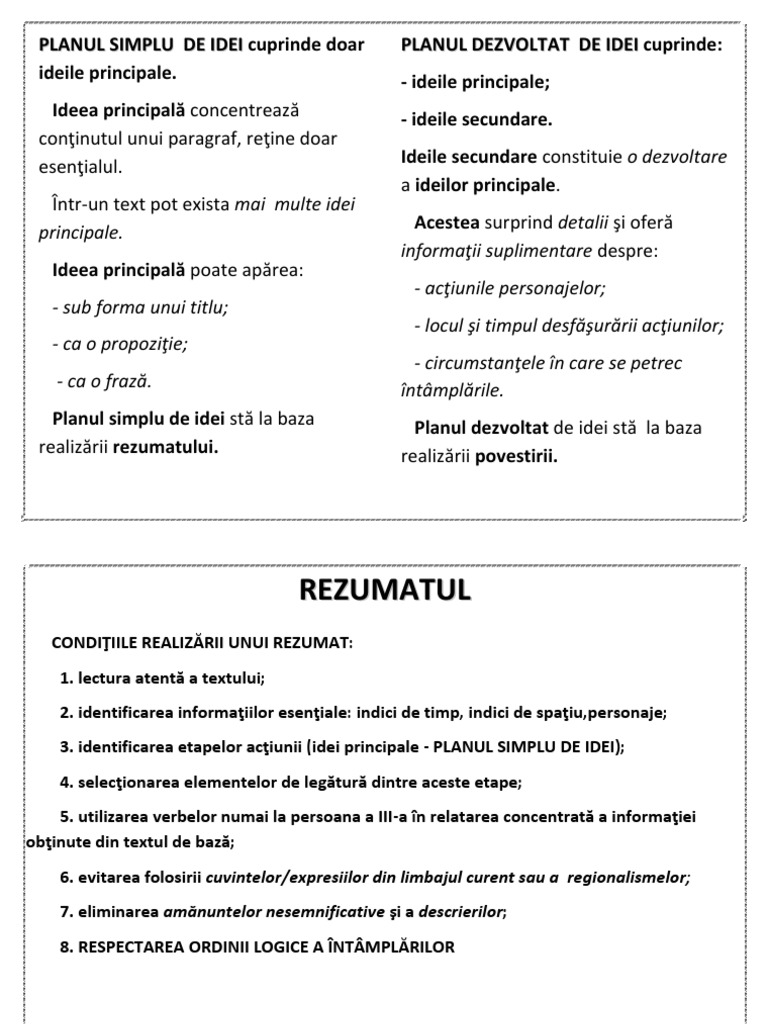 Naraţiunea Ideea Principală Ideile Secundare Planul Simplu De