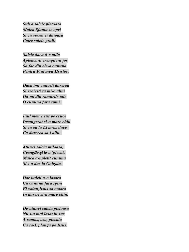 Fiul meu e sus pe cruce insangerat si n mare chin si cu ea la el m. Sub o salcie pletoasa sub o salcie pletoasă maica sfântă se ruga şi cu vocea ndurerată către salcie grăia. Operațiunea dulapul cu.
