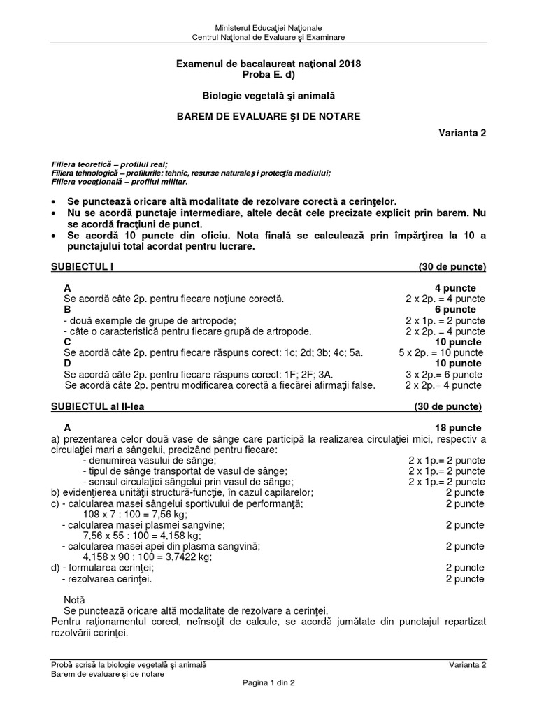 Subiecte Biologie Vegetală și Animală 2018 Edu Ro Avem Baremul