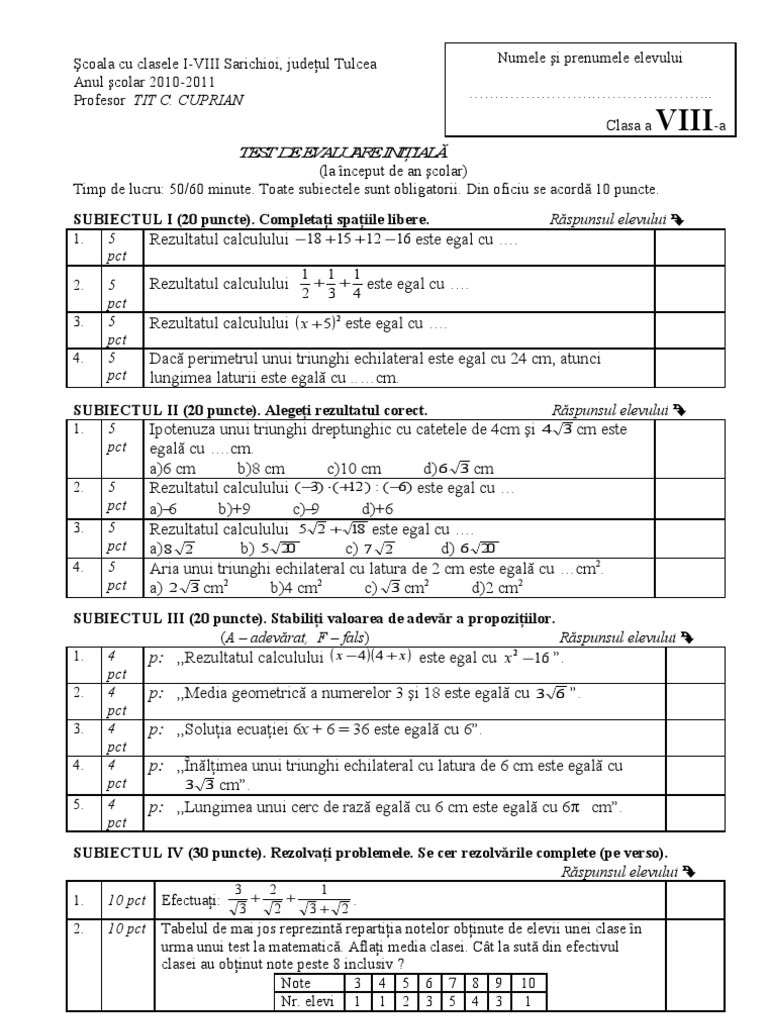 Test Initial Matematica Clasa A 8 A Cu Rezolvare Barem An