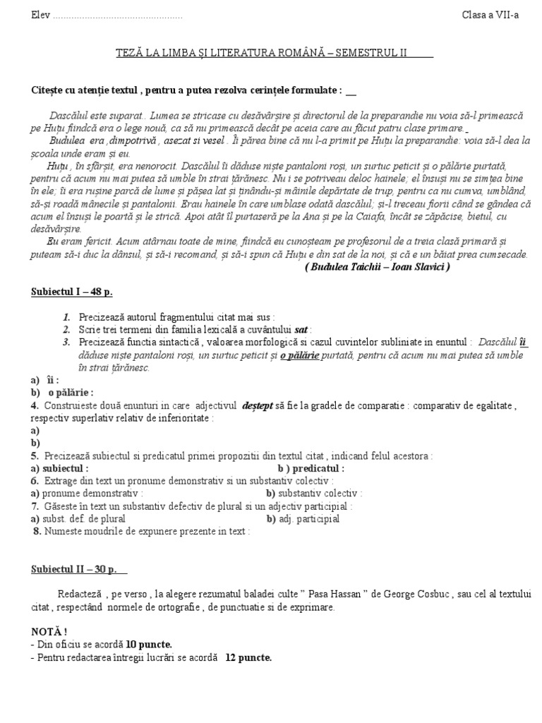 Teză Cu Subiect Unic Limba Romană Clasa A 8 A An școlar 2018 2019 Semestrul 1 Subiect și Barem Tsu Isj Ilfov